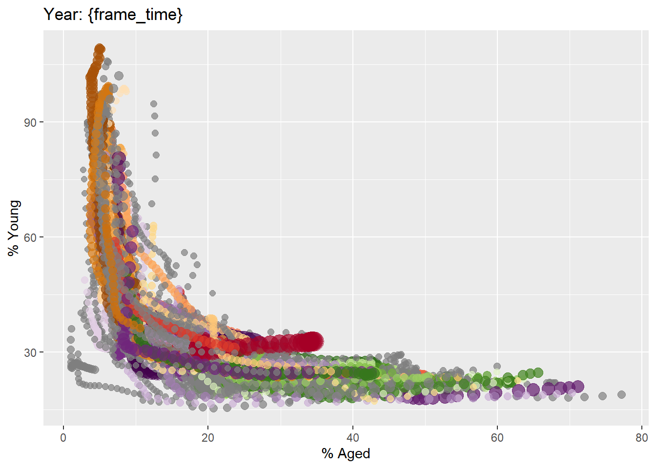 transition_time()of gganimate is used to create transition through distinct states in time (i.e. Year).ease_aes()is used to control easing of aesthetics. The default islinear. Other methods are: quadratic, cubic, quartic, quintic, sine, circular, exponential, elastic, back, and bounce.