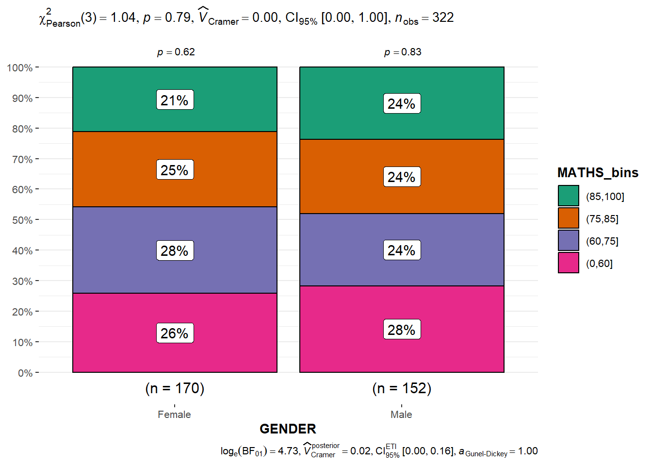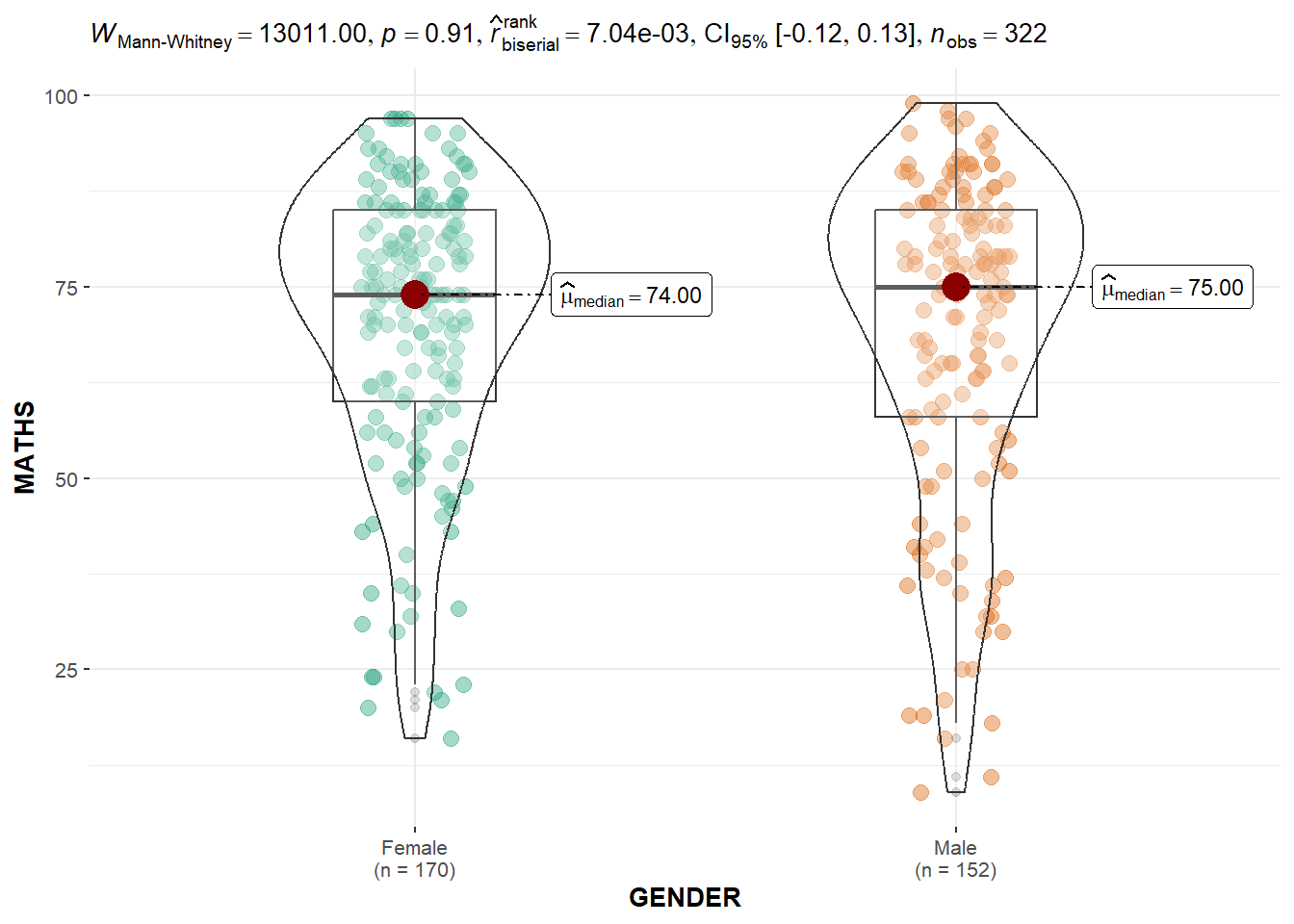 In the code chunk below, ggbetweenstats() is used to build a visual for two-sample mean test of Maths scores by gender.